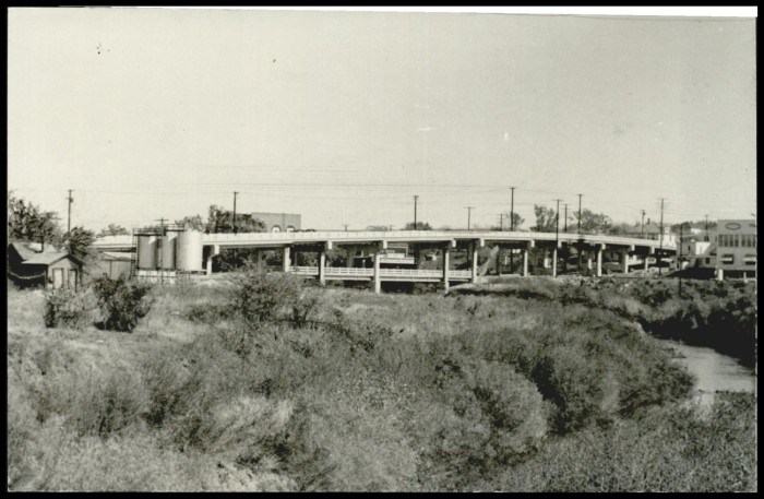 The upper level is one-lane each way, beginning at N. 2nd Street and ending at N. 5th Street. The viaduct is constructed of concrete and crosses several railroad tracks, as well as the Creek.