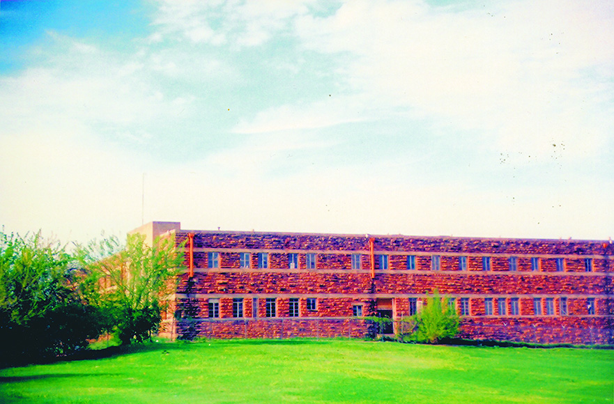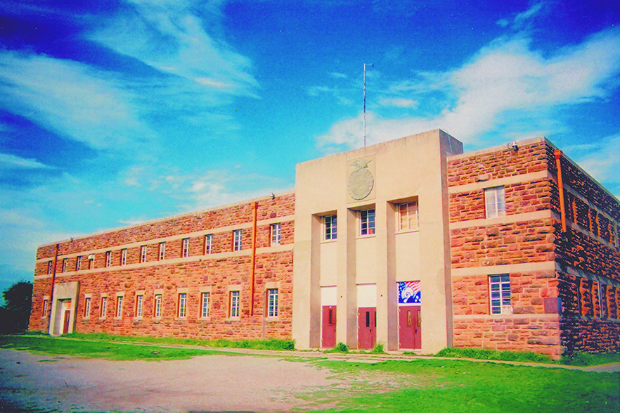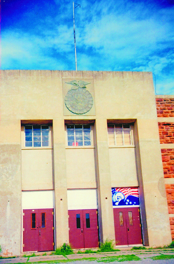 This L-shaped building that has a entrance facing west on the corner of the L has three pairs of double doors under a concrete columned extension. There is a FFA shield on the centered of the parapet above the entrance. Concrete bands at levels of lentils and windowsills.