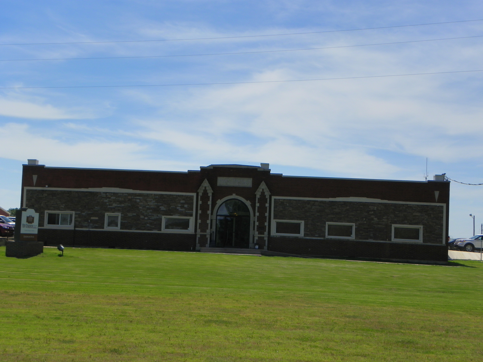 The old Centerview School is a single-story, five-room, rectangular (93′ x 56′) structure constructed of brick. The flat roof has parapets with a brick cap. The front entry is recessed behind an arch of cut limestone and framed by two pilasters and a stepped roof line cornice. The pilasters and the cornice are highlighted by limestone insets. End doors are also recessed behind brick arches that have decorative limestone insets. The window openings have continuous brick sills that wrap around the entire building. Wood insets in the windows have not compromised the architectural integrity of the building.